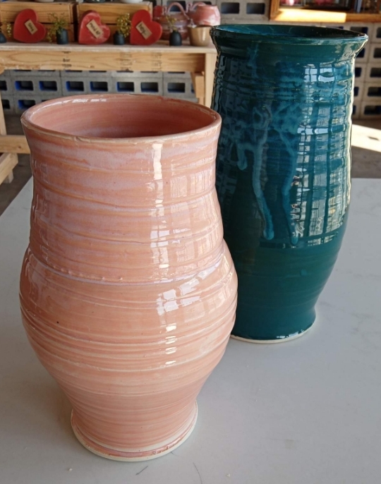 Last time I was here at PIP Coffee & Clay I left my rain jacket. I found when I came to retrieve it this afternoon that these two vases of mine had survived the glaze firing. And since this blog ig called “One with Clay, Image and Text” I thought it behooving to post this Clay Image and backstop it with Text. Since it will be seen worldwide, you could call this an elegant way to Vase the Nations. 🙂