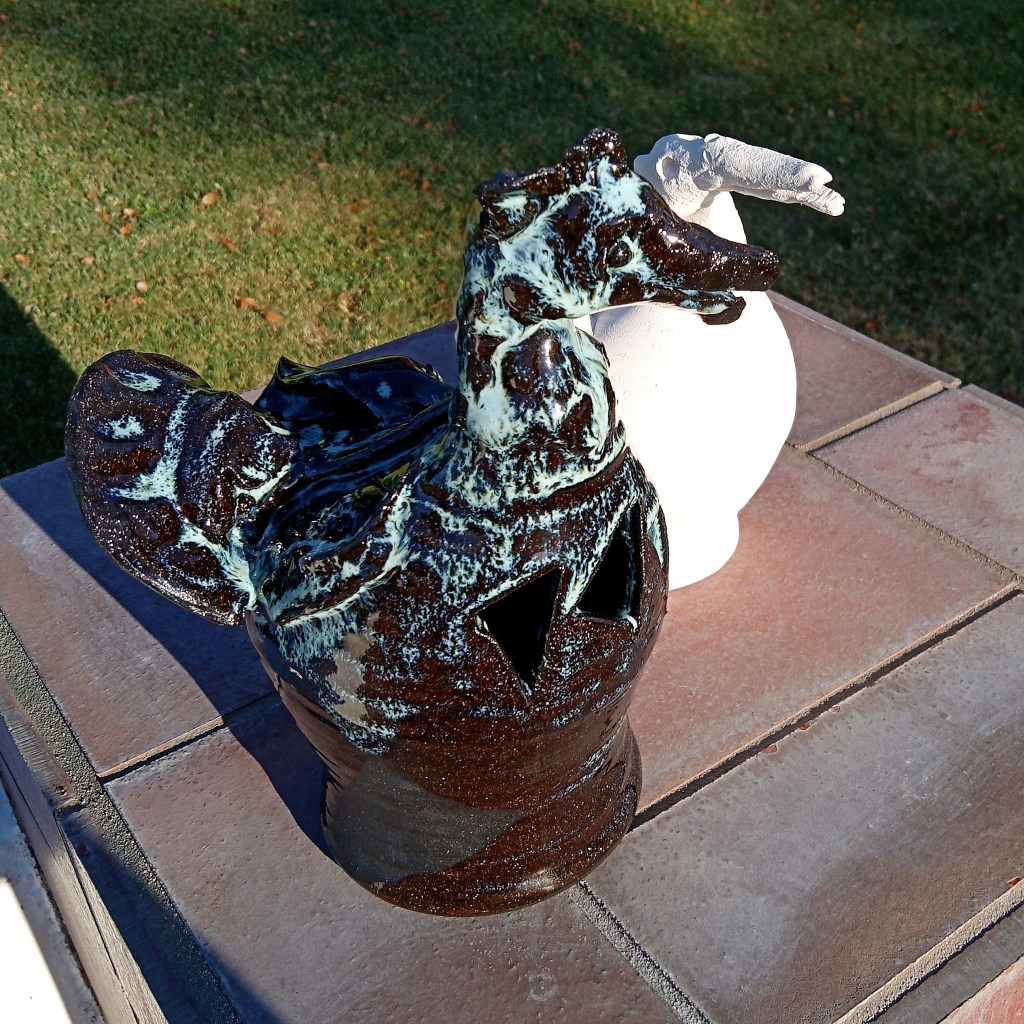 Here are two of my recent bird sculptures. One is glazed, one unglazed, and I may leave the unglazed one as is because it is nicely ghostlike in contrast to its mate. If my diabolical plans come to fruition, they will be worth at least $1000 US each in less than two years. But I’d be glad to sell the both of them TODAY ONLY for a grand total of $100.00 plus shipping (free delivery in the Phoenix, AZ area, though). Any interested party may either leave a comment on this post or e-mail me at onewithclay@hotmail.com. Deadline is midnight Mountain Standard Time today, May 29, 2023. Support the Arts, Friends!!