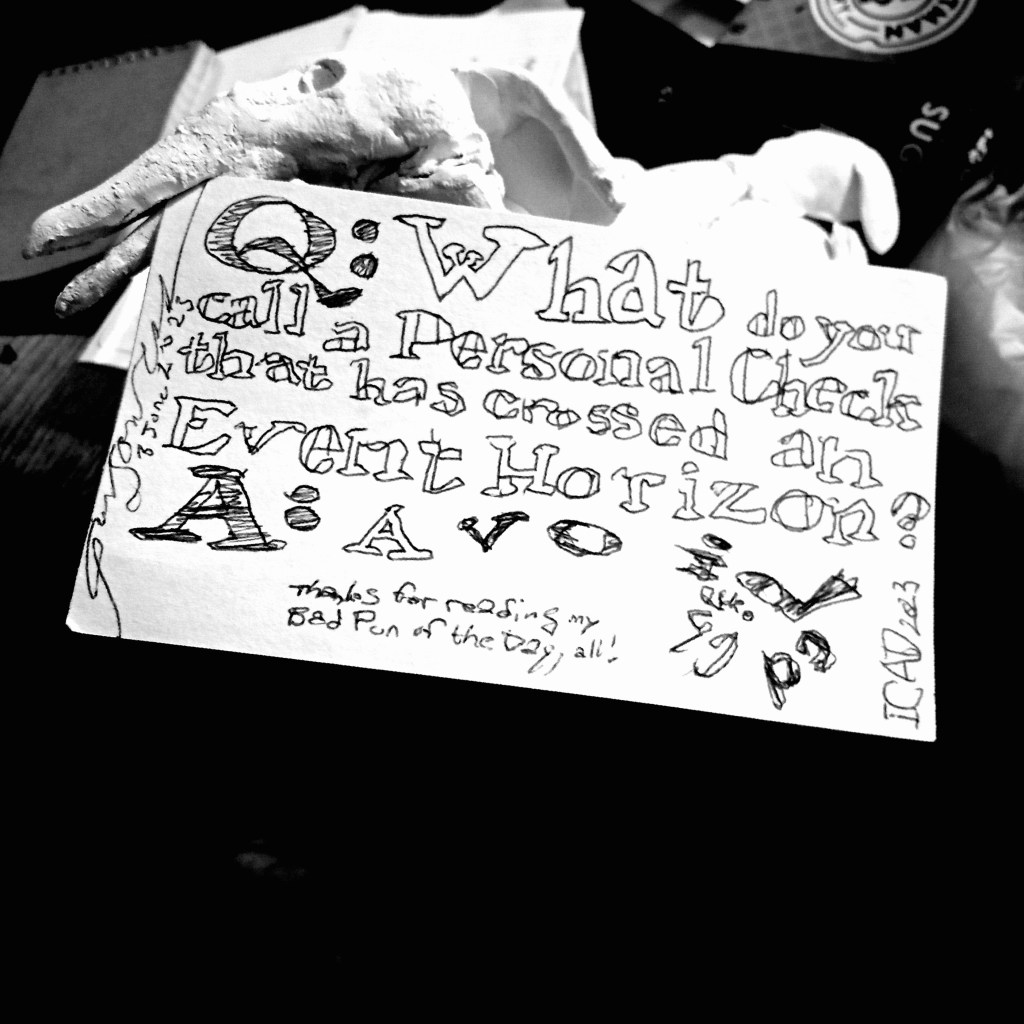 June 3, 2023Uncategorized Leave a comment ICAD 2023, day 3: Q&A Q: What do you call a Personal Check that has crossed an Event Horizon? A: A voided check. (Thanks for reading my Bad Pun of the Day, all!) Share this: Click to share on X (Opens in new window) X Click to share on Facebook (Opens in new window) Facebook Like Loading... Related artblack holesGary BowersICAD 2023puns