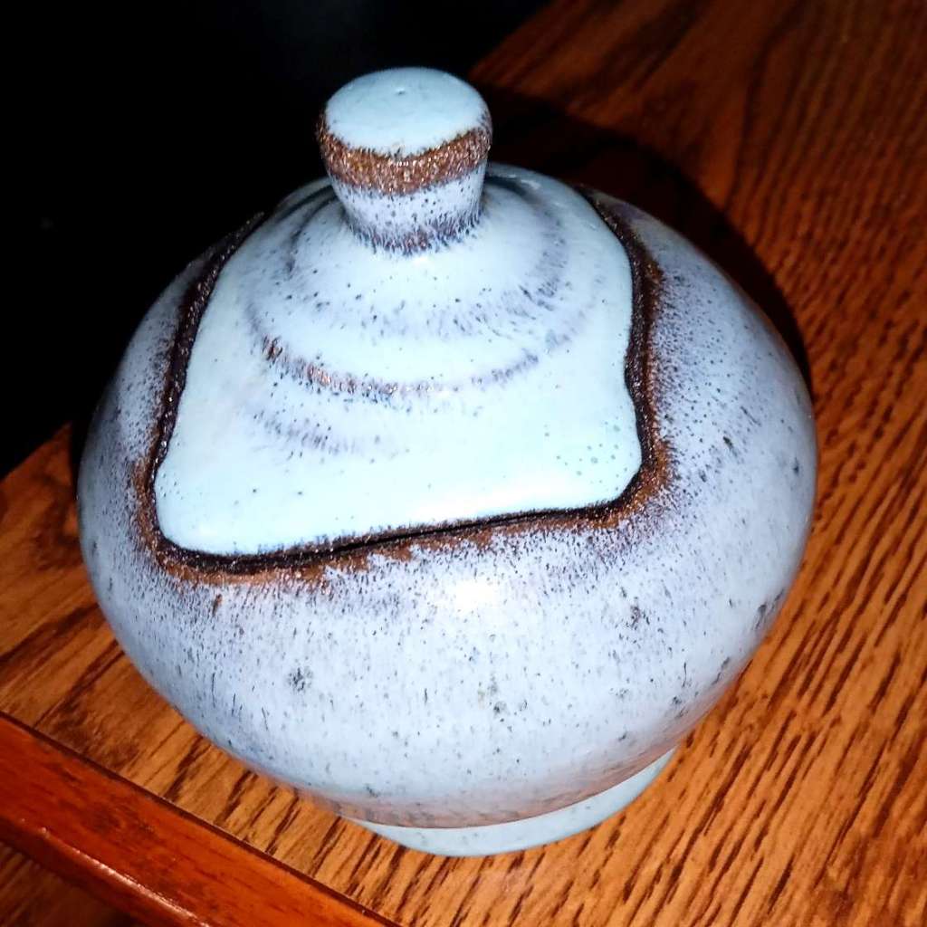 Fresh out of the kiln, here’s one of my more successful cut-lidded forms. The unglazed underside shows a charcoal-black clay body. Heat and gravity pulled the glaze down below the join, making for a delightful contrast. There might be a teapot in the future with this clay, glaze, and cut-lid approach.