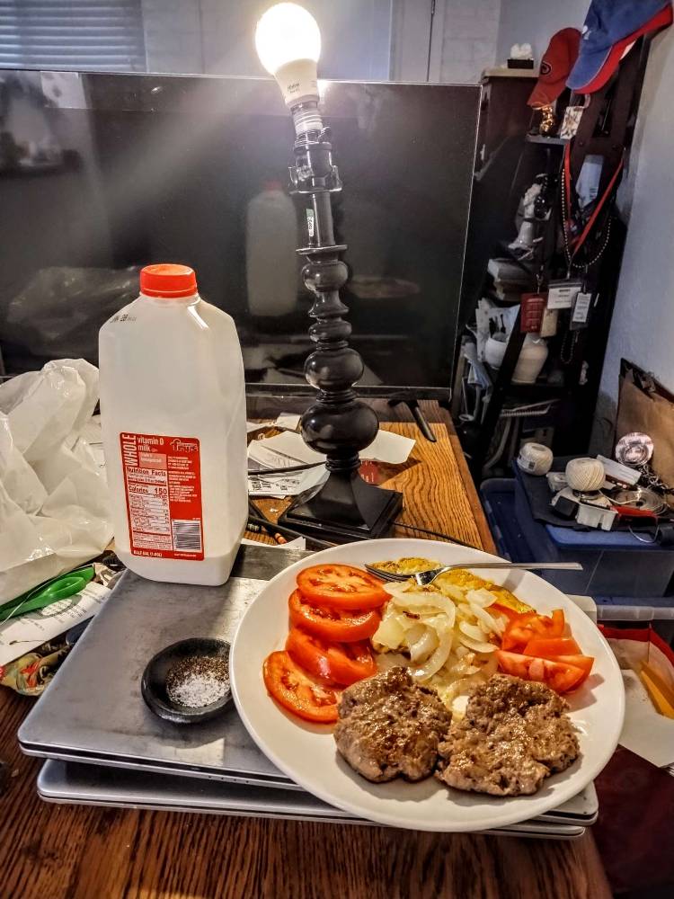 a flip for the sausage patties, a lowering of the heat, and i let the patties fry while i put the plate of eggs and cheese and onions in the microwave for thirty seconds. added the sausage patties to the plate. put the plate on the laptops on the table and set kosher salt and pepper next to the plate and the mostly-empty jug of whole milk nearby. took and photo edited the photo you see.