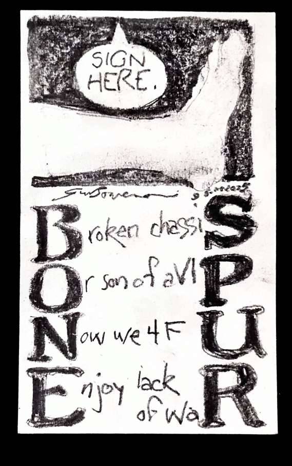 June 9, 2025Uncategorized Leave a comment Bone Spur II: Acrostic Broken chassis Or son of a V I P Now we 4F U Enjoy lack of war Share this: Click to share on X (Opens in new window) X Click to share on Facebook (Opens in new window) Facebook Like Loading... Related 4Fbone spurdraft-dodgingGary Bowerspoetry