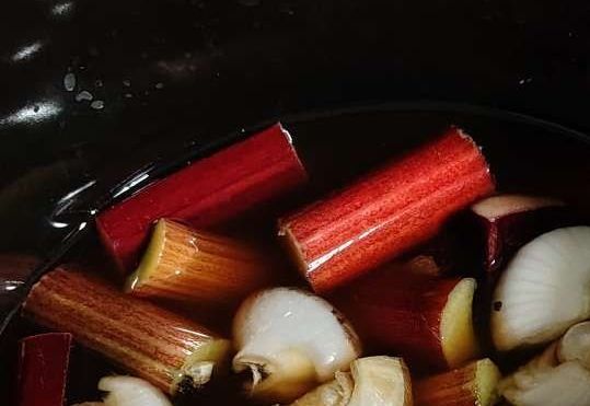 pour the broth into a crockpot on low-heat setting. add protein. remove the seed- and stem-laden tops from the peppers and cut longitudinally into strips, then cut the strips in half widthwise; add to broth. cut rhubarb stalks into one-inch lengths;add to broth mm halve the potatoes after scrubbing them squeaky-clean (do not peel); add to broth. prepare the alphabet soup separately, following the instructions on the can.