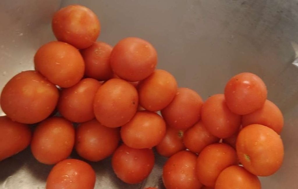eighty-eight point eight pounds, forty kilos, of tomatoes into a large container