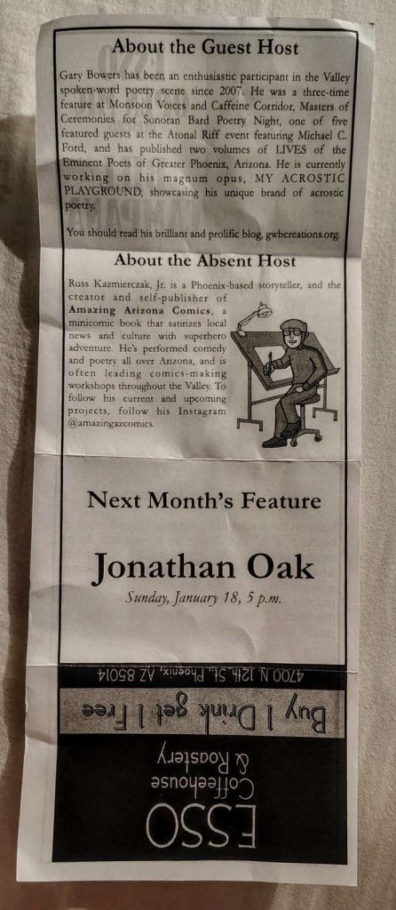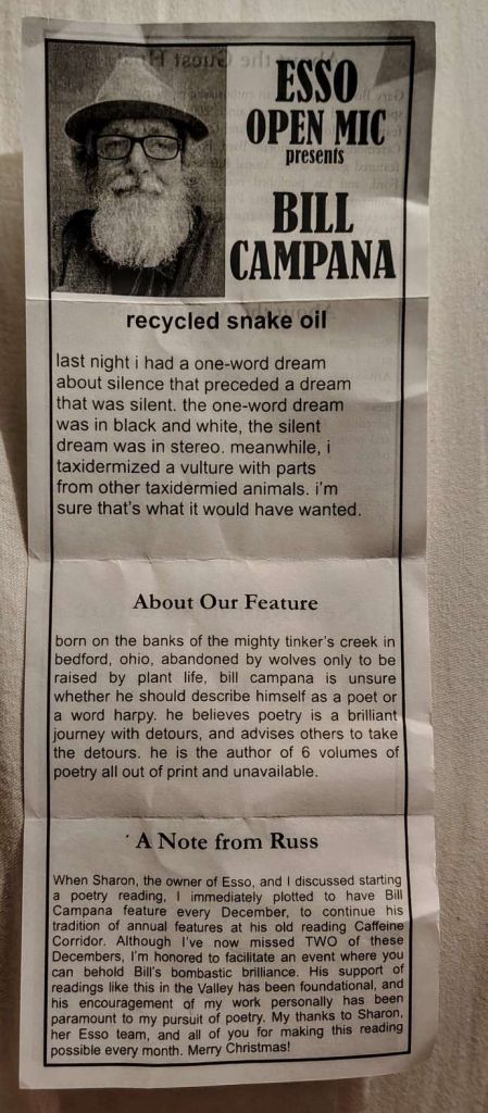 Every third Sunday, except in the brutally hot summer months, the Valley’s own Esso Coffeehouse is the venue for a poetry event. Event host Russ Kasmierczak and Esso proprietor Sharon Kroger have decreed that every year, spoken word superstar Bill Campana, whose birthday is in December, shall be the December feature.
