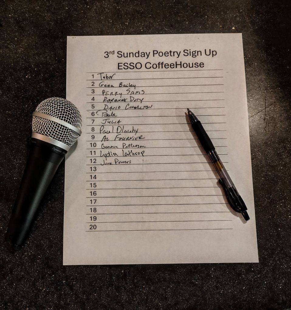 A dozen quite distinct poetic voices signed up for the open mic. Here is the list, and the mic, and the pen that was used to sign up: