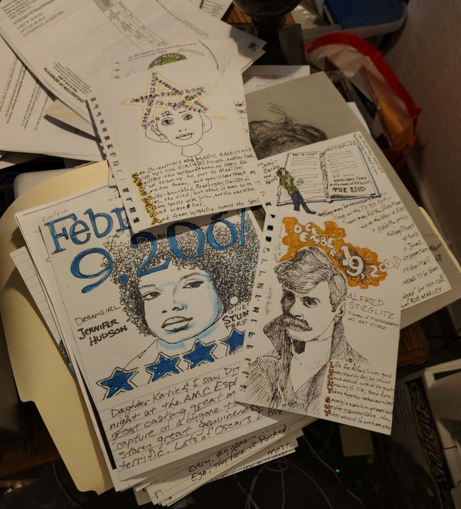 Tomorrow an outfit named Merry Maids will clean my apartment. I have begun de-cluttering the floors to facilitate their operations. Meanwhile I hope to pare downy possessions, and this image shows a test of my set of old Crayola markers. They are still usable, and now, having whetted my appetite with this exercise, I want to go back to using them. But I have so much decluttering to do that I must firmly stick to the mission, telling myself “No more distractions.”