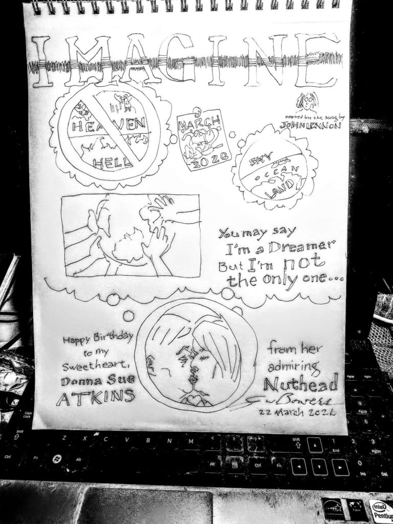 She picked John Lennon’s anthemic “Imagine.” So I Imagined from 8:15 to 9:45 PM on 12″ by 18″ all-media paper, using a pen that had almost run out of ink; see above. It is OK as a rough draft of concept but clumsy in execution. But as a fulfillment of a birthday gift commitment it works. She now has (more) indisputable proof that I am crazy about her.