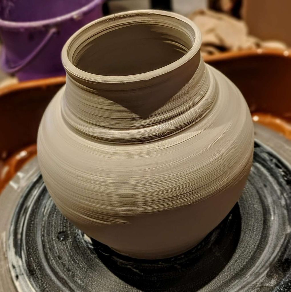 When it becomes leather hard I may take a pebble or a spoon and burnish the surface, perhaps in a pattern, perhaps overall. I may do some carving as well. I miss my carving days.