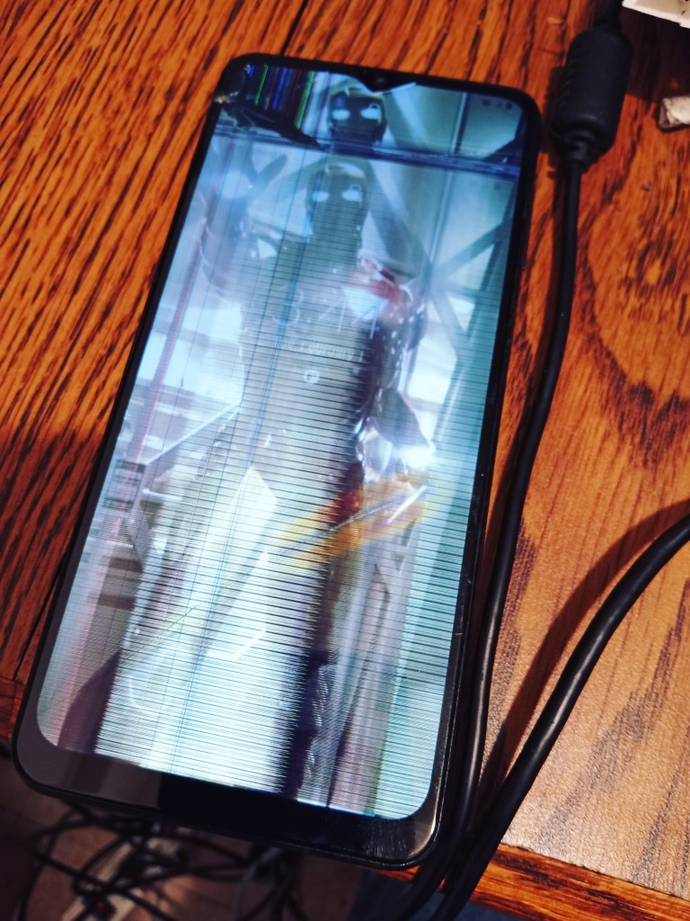 Two days ago I was walking home, looking at my smartphone. Decided to put it away and concentrate on walking. It snagged on my hoodie’s pouchpocket and fell on some gravel. The screen was splintered near the upper left corner, and the display was radically altered, with ghost-images, dimming, and a test-pattern-esque block where the impact had been.