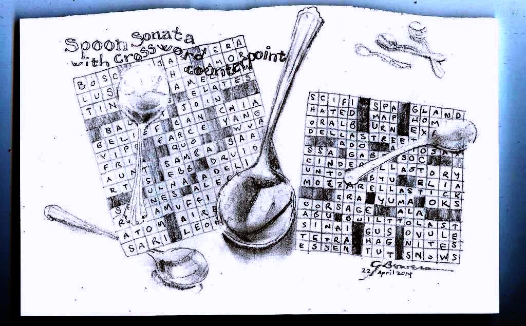 So this decades-later, much-simpler drawing of mine is “Spoon Sonata with Crossword Counterpoint.” I got lucky with the alliteration. [smiles]