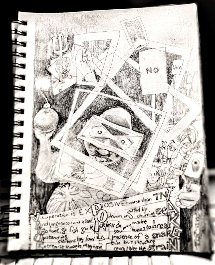 The title is “Chaos Floss.” What does that mean? It might mean Random Inconsequence, and I think it does, a bit, in this case. At left is a seeming agitated figure holding his head. He appears to be enclosed in an oval or sphere but is in fact enclosed in the negative space created by the two leftmost panels of a four-panel sequence. There are spheres, increasingly small, upward and to the right, which when viewed with the negative space of the figure’s enclosure might be remindful of a series of photos of a planet in orbital motion. The gravitational pull creating the orbit appears to be the “2019” of the signature/date slugline. Did the artist do that on purpose? Does it matter? Does it work with the rest of the page? (Note from the artist: I THINK it does, just as the rug in Jeffrey Lebowski’s front room “really tied the room together,” but I am not the best judge, being partial to my own efforts. YOU are the best judge.)