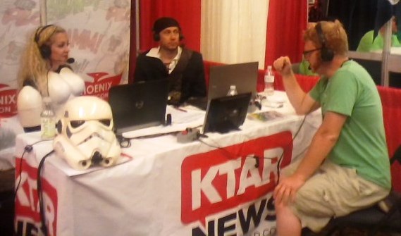 And here’s the man himself being interviewed by KTAR radio personalities Mike Russell (in Captain Morgan garb) and Pamela Hughes (a STAR WARS storm trooper, with a probably-unnecessarily modified breastplate). If you were lucky enough to be tuned in to 92.3 at 9:12am on Friday, May 29, you heard Russ more than holding his own against these two.