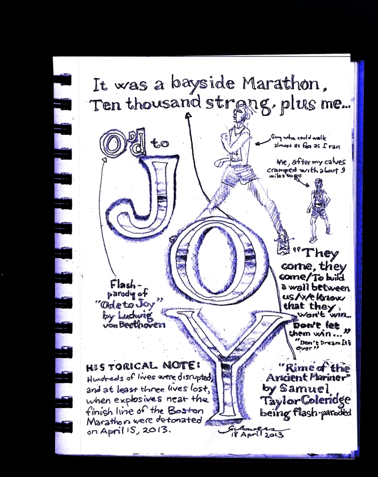 The explosions at the Boston Marathon–I just don’t know how to integrate this tragic event into the harmonious micro-continuum I occupy. When thinking about them I did the above and the below images/wordages, and they seem oblique indeed. But Dooodle Therapy always helps me cope with life’s rugpullings, and reminiscing about my first Marathon, San Francisco in 1984, is a comfort, and I hope no slight to the maimed and dead. This is a wake in the wake of the tragedy, and instinct has me acting like a Who in Whoville after the Grinch has stolen all the Christmas presents. (Continued respect and affection for Dr. Seuss, reprises the “Loose as a Seuss” blog post.)
