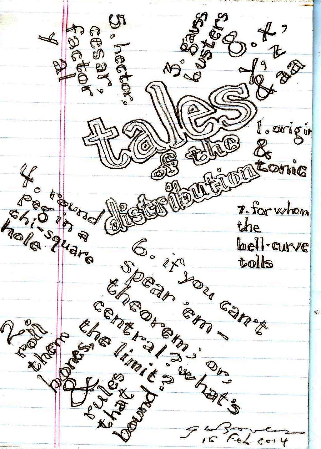 Here’s the horror: In order to tell the REAL Tales of the Distribution, I’d have to go back to school or self-study to refamiliarize myself with 1) polar coordinates 2) Payne’s theorem 3) Johann Carl Friedrich Gauss 4) Chi-squared curve smoothing 5) Use of factorials in permutations and combinations 6) the Central Limit Theorem 7) probability density function calculus 8) n-dimensional space. That prospect is horrific to me. My time is better spent communing with my friends and loved ones, composing acrostic poetry based on wordplay and subject matter I well know, enjoying the local landscape and other scenery, and making that tiny piece of the world within my jurisdiction a better place.