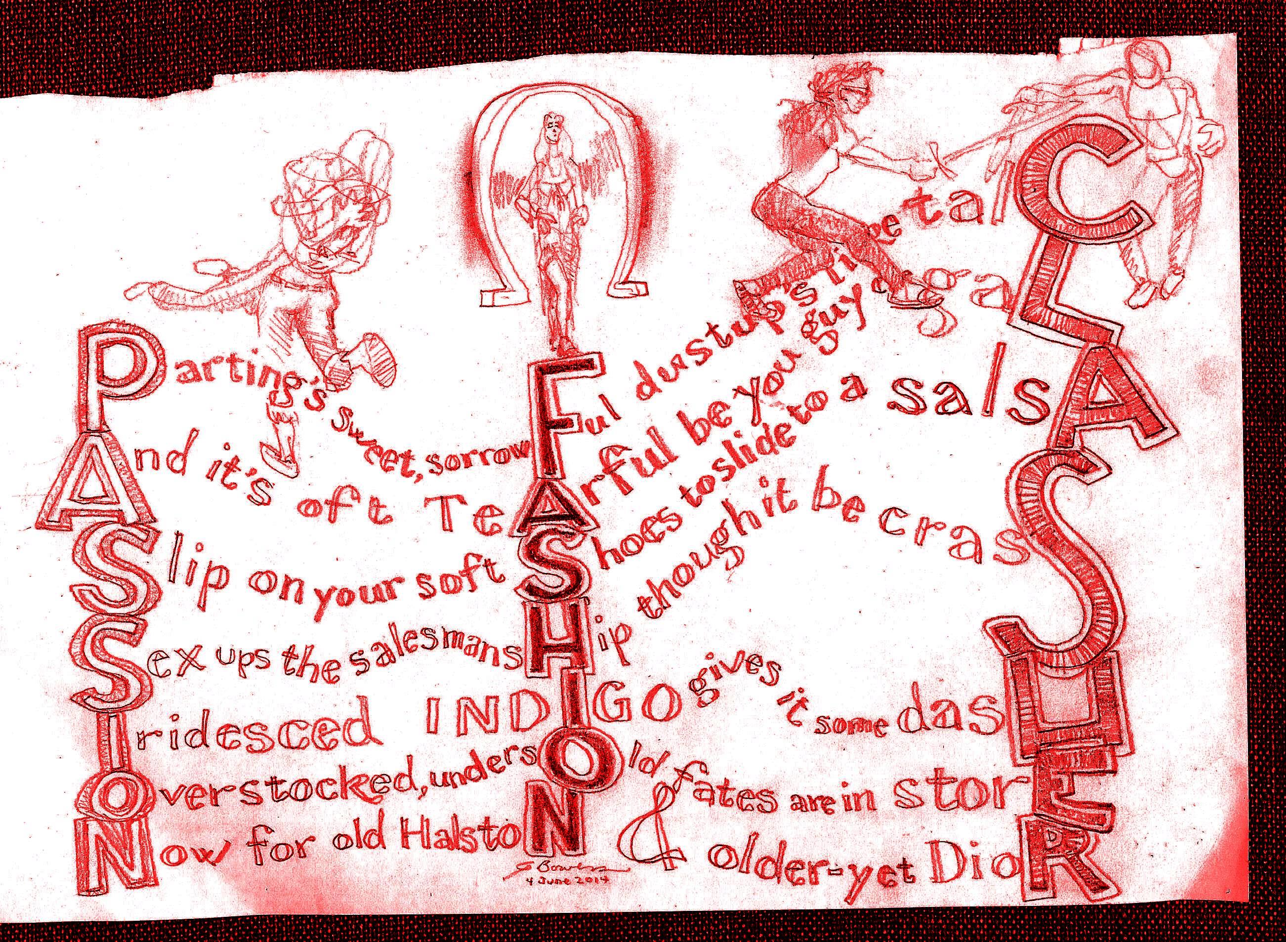 The Mall where they sell youth and tally-/Ho Lasses and Lads Game’s Afoot/Expressing your passion/With high crimes of fashion/And studies in vellum and soot