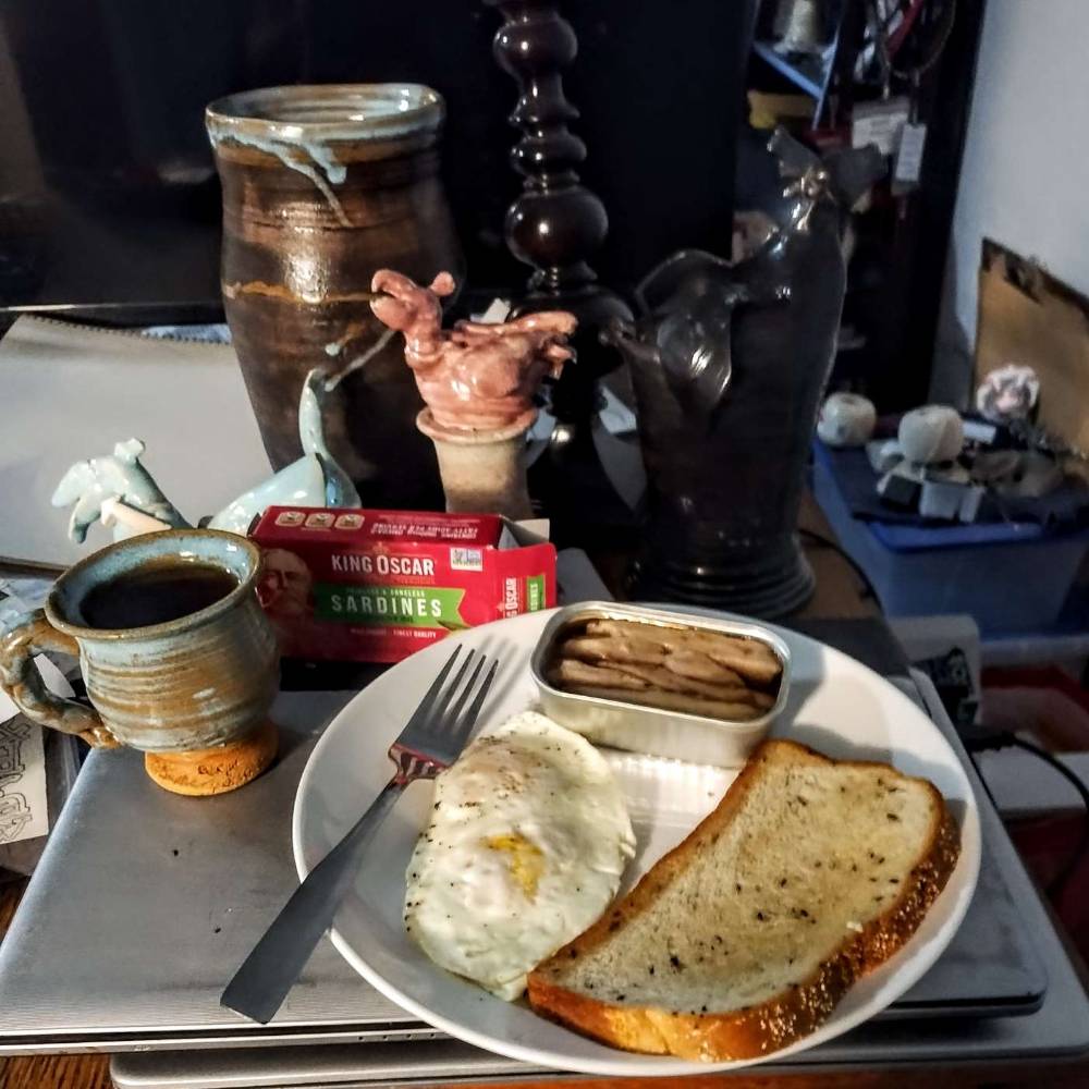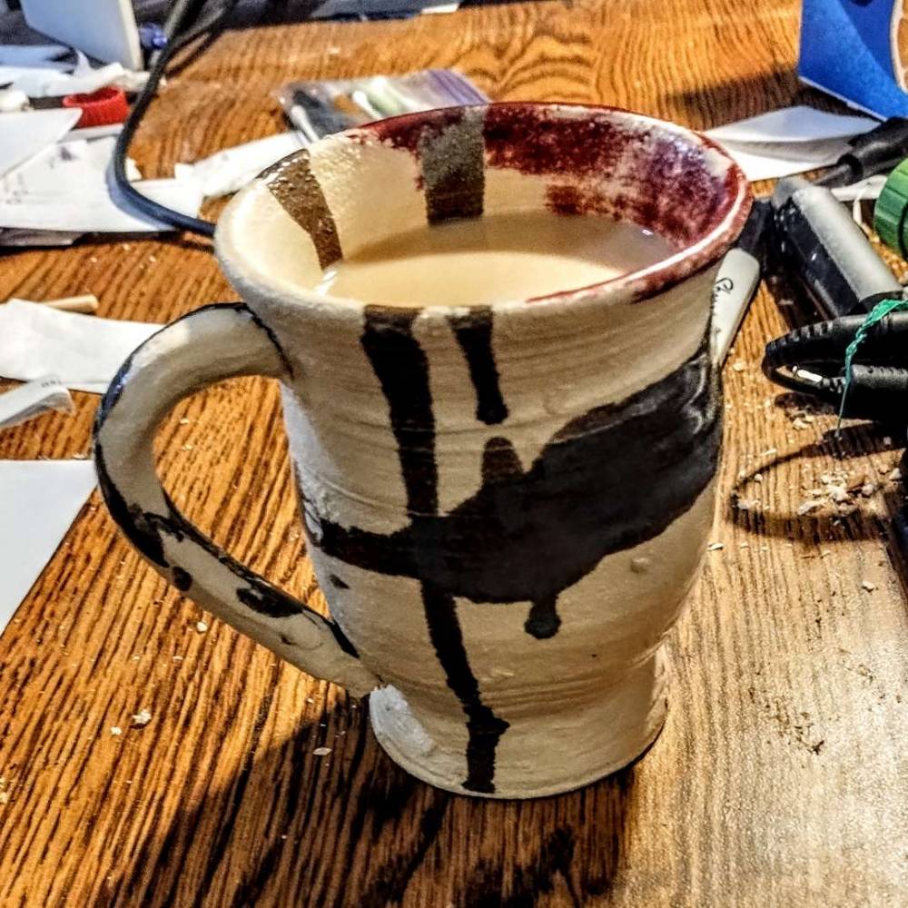 I made these mugs in late March and have glazed them to look like the coffee they contain. In both mugs are eight ounces of Americano coffee enhanced with cream and brown-sugar Simple Syrup. It is my wildly optimistic pipe dream that I will one day offer the mug of her choice to a future Special Someone, so that we might sit across from each other at a breakfast table and sip from our coffee-glazed coffee mugs while enjoying each other’s peaceable company. Hope survives, steamy and eternal!