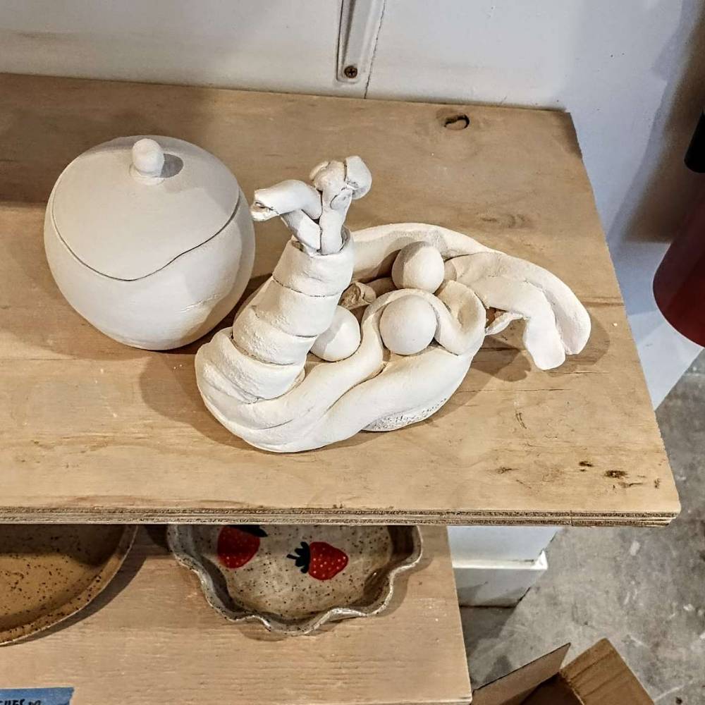 Today at PIP Coffee and Clay these two items came from the bisque kiln. The one on the left is a closed vessel with a cut-out lid. I have given it to PIP’s barista and resident sculptor Nadia L as a wedding present. She married her sweetheart Daniel some weeks ago. “Glaze it any way you want,” I told her.