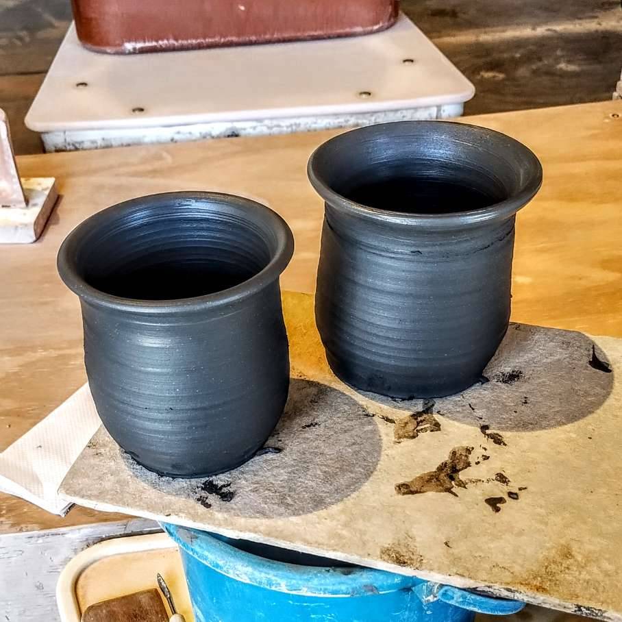 This went well with the three smaller mugs, and I still had session time, so I carefully trimmed the still-soft larger mug and put the last, largest handle on it, completing the quartet.