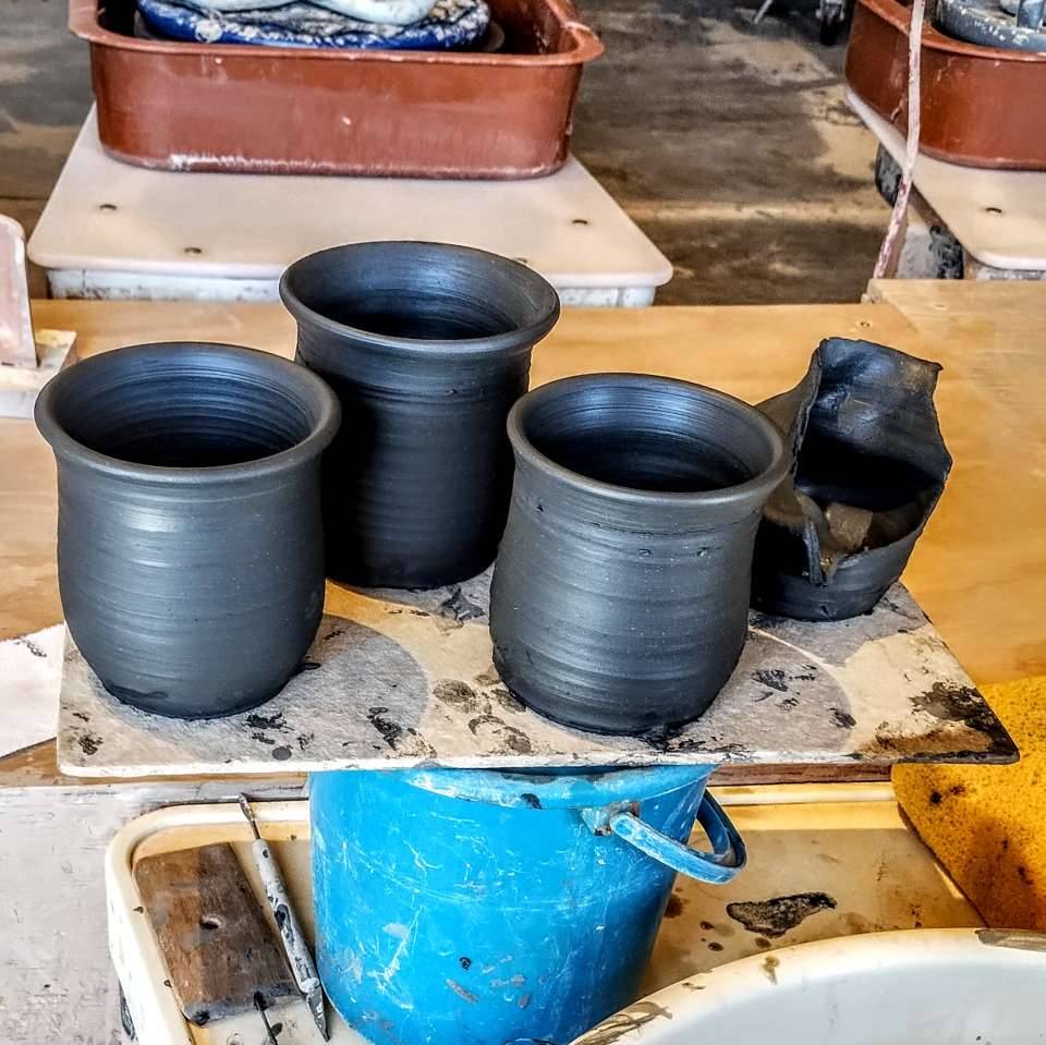 I had enough reconstituted scrap to pull four handles, and one by one I affixed them to the mug bodies via the Slip&Score method.