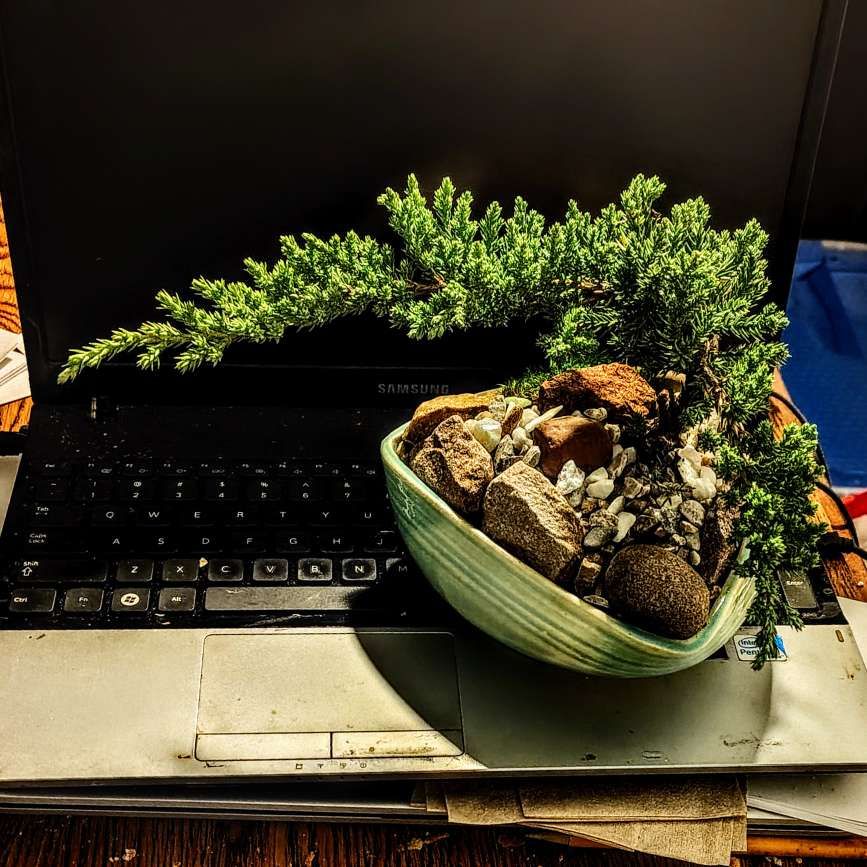 Yesterday (see previous post “giftie gie us”) I brought a triangular vessel I had made to a man running a bonsai stand, wondering if my vessel might be made to sustainably containp one of his plants. I am happy to present the result, and ecstatic about the way the man had the bonsai echo the triangular design of the vessel. I’ve presented a photo to Donna today via text-message attachment, and I’ll give her the real thing when we get together.