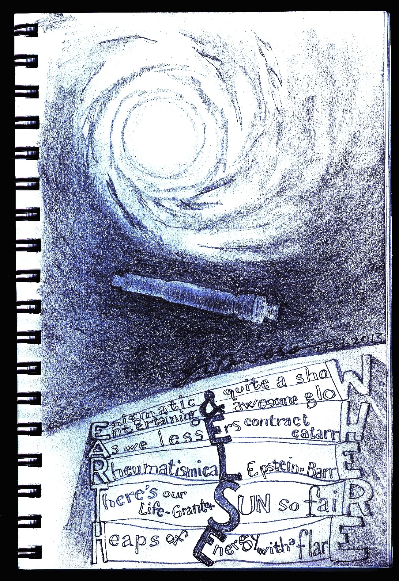 My drawing is meant to be a mysterious metaphor for winning and winners. I apologize for the murk–I both underworked and overworked my penciling. I imposed a deadline for myself of today, and got a little too ambitious with the implied planets and archetypical competitors and pseudo-calligraphy and such. But if you look carefully you’ll find a niftily drawn cat, and the clear message that felines are born winners.