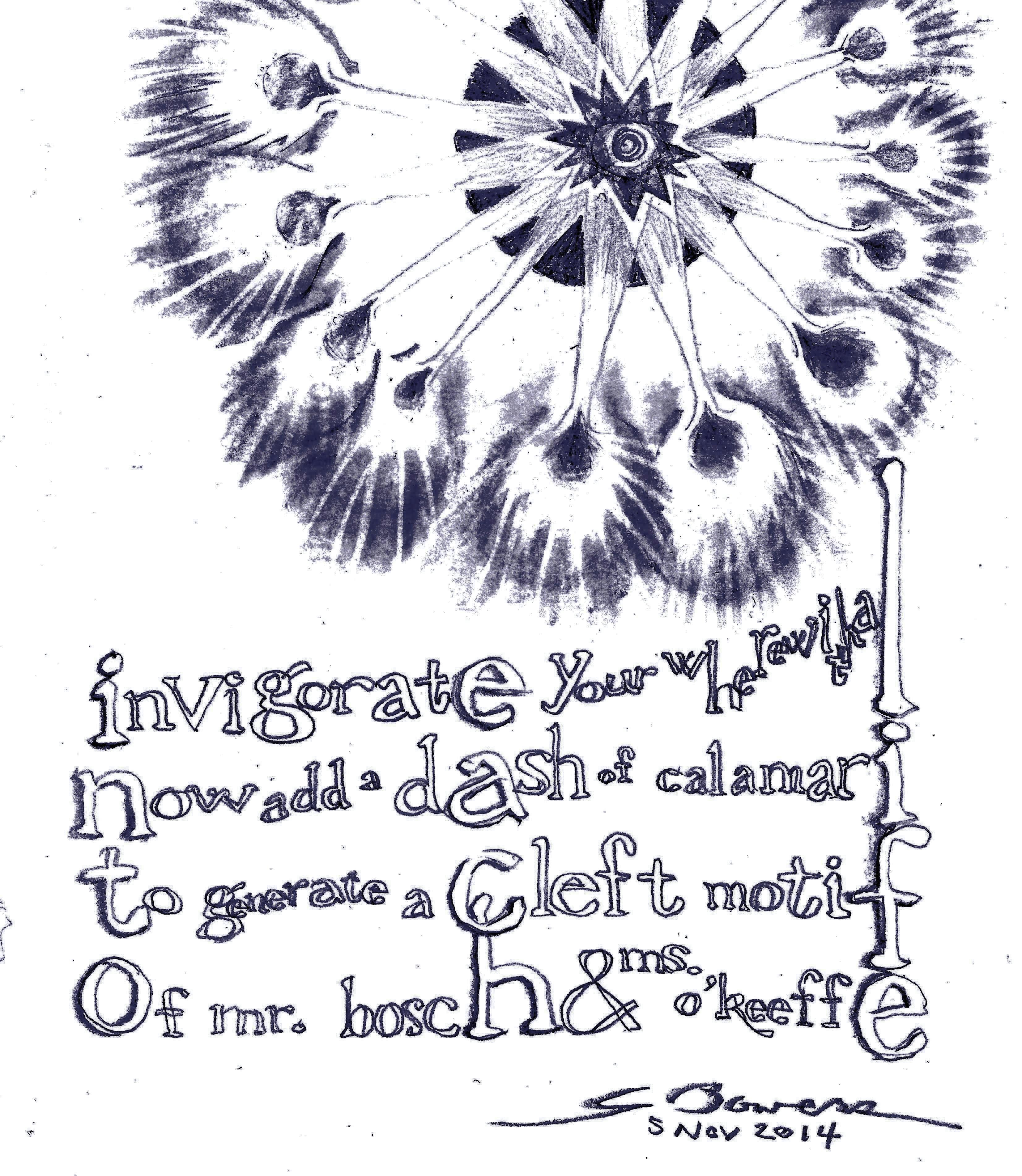 How this drawing came to be: Last February I sent my friend Karen, who has done me innumerable favors, a dozen yellow, meaning Friendship, roses, with a card that read KAREN, YOU ARE ALWAYS THERE. I SURE APPRECIATE IT. LOVE, GARY. After she got them and thanked me I asked her to please send me a photo, since I’d never seen them. (We live in different cities.) She graciously did so, and I started a drawing based on the photograph, then stopped in mid-line, following the “put this away for a while” hunch. Today I had another look at it, and the oxymoronic “Rose Fell” popped into my head. Then Faye Dunaway, in a western-southern accent, in LITTLE BIG MAN: “…and I am a Fallen Flowah.” Then Arthur Brown, self-proclaimed “God of Hellfire,” sang the opening lines, quoted above. Then a slide show of Man’s Inhumaneness to Flora and Fauna informed my acrostic.