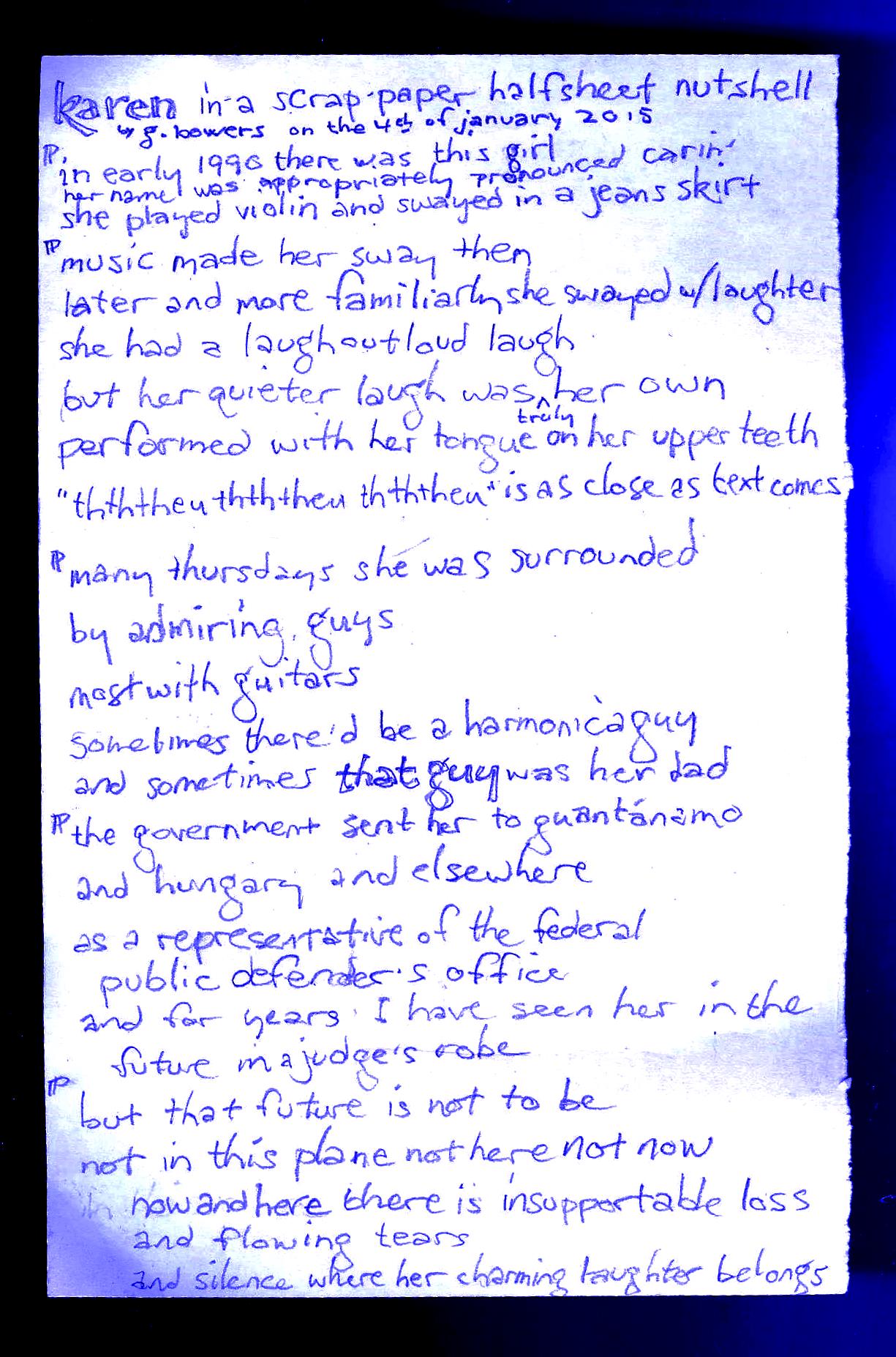 The would-be poem seems finished but is not. After Karen died, I tried again, and wrote what I intend to read at the Caffeine Corridor poetry event tomorrow night: