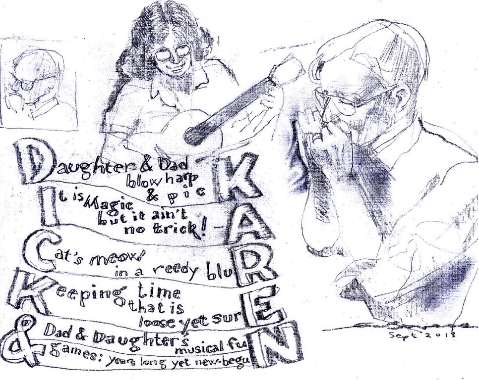 He also plays harmonica, and the “Have Harp, Will Improvise” on this page refers especially to his spot-on, unrehearsed accompaniment to one of my own performances, when he didn’t know a word of the poem I was doing and only had the threadbare instruction “Start with a sort of walking-blues vibe and then just react to what I say…” He helped alchemize my rather leaden, monotonous-voiced recitation into entertainment gold (judging by the enthusiastic crowd response). Paul not only saved my bacon, he put a fluffy omelet next to it. He is a man of gentle Greatness.