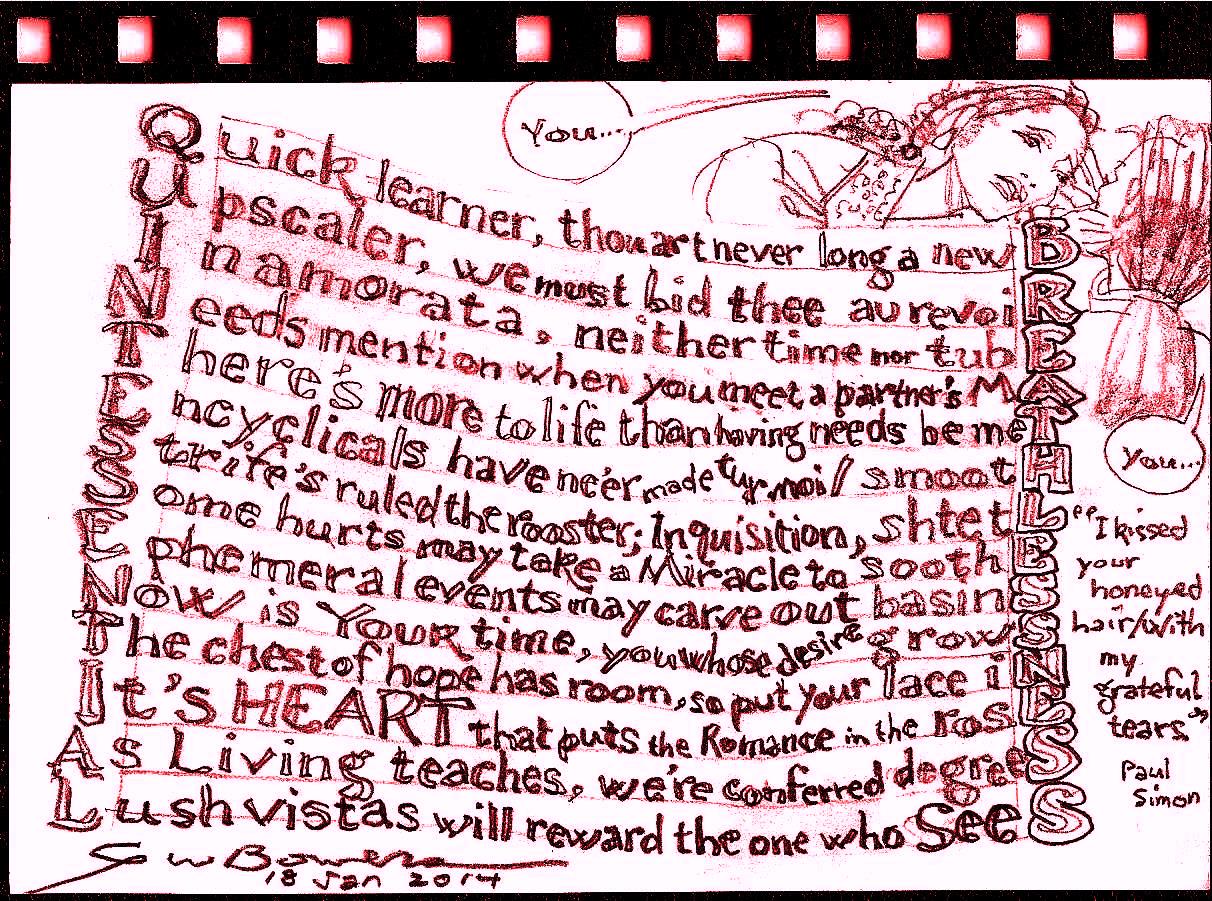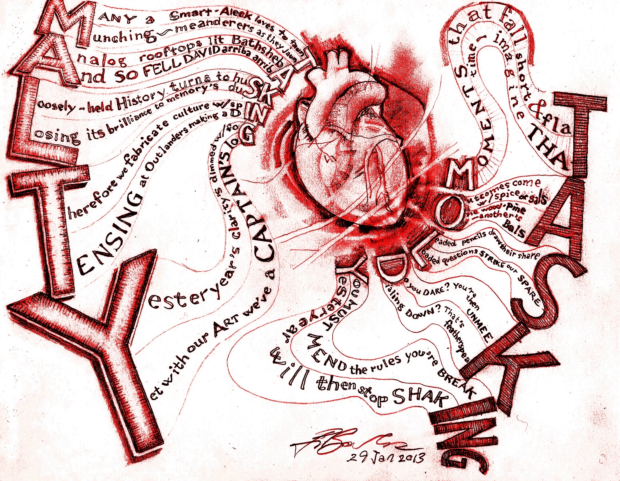 Afterword: This afternoon I came home from work exhausted, probably more due to sleep-deprivation the night before than from the rigors of work. I woke feeling refreshed and, still in bed, started to browse the Internet with my phone–but soon found the phone falling out of my hands as I nodded off. “Well, let’s take another nap.” In my second nap I had a dream substantially like the poem I have just written. I wrote a draft and was struck by the dream’s kinship to “In the Desert” by Stephen Crane. I then slightly rewrote the poem to make the cadence and language more Cranelike, more starkly descriptive; and I dedicated the poem to the spirit of Stephen Crane, one of my literary heroes.