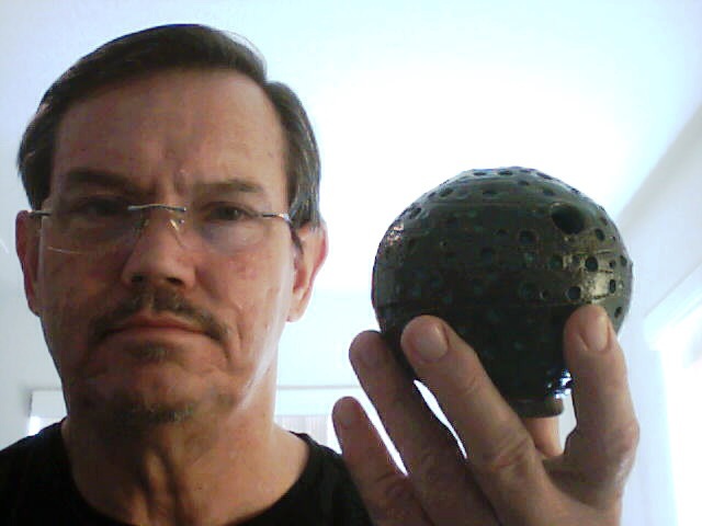 The big sister of Li’l Universe is much closer to bowling-ball size than her kid sibling, though still marginally shy of regulation size. In the photo above I’ve included one of my “business” cards, measuring 2 inches by 3-1/2 inches (approximately 50mm x 75mm if memory serves, Michel), to show scale. I also took a couple of webcam selfies, thus: