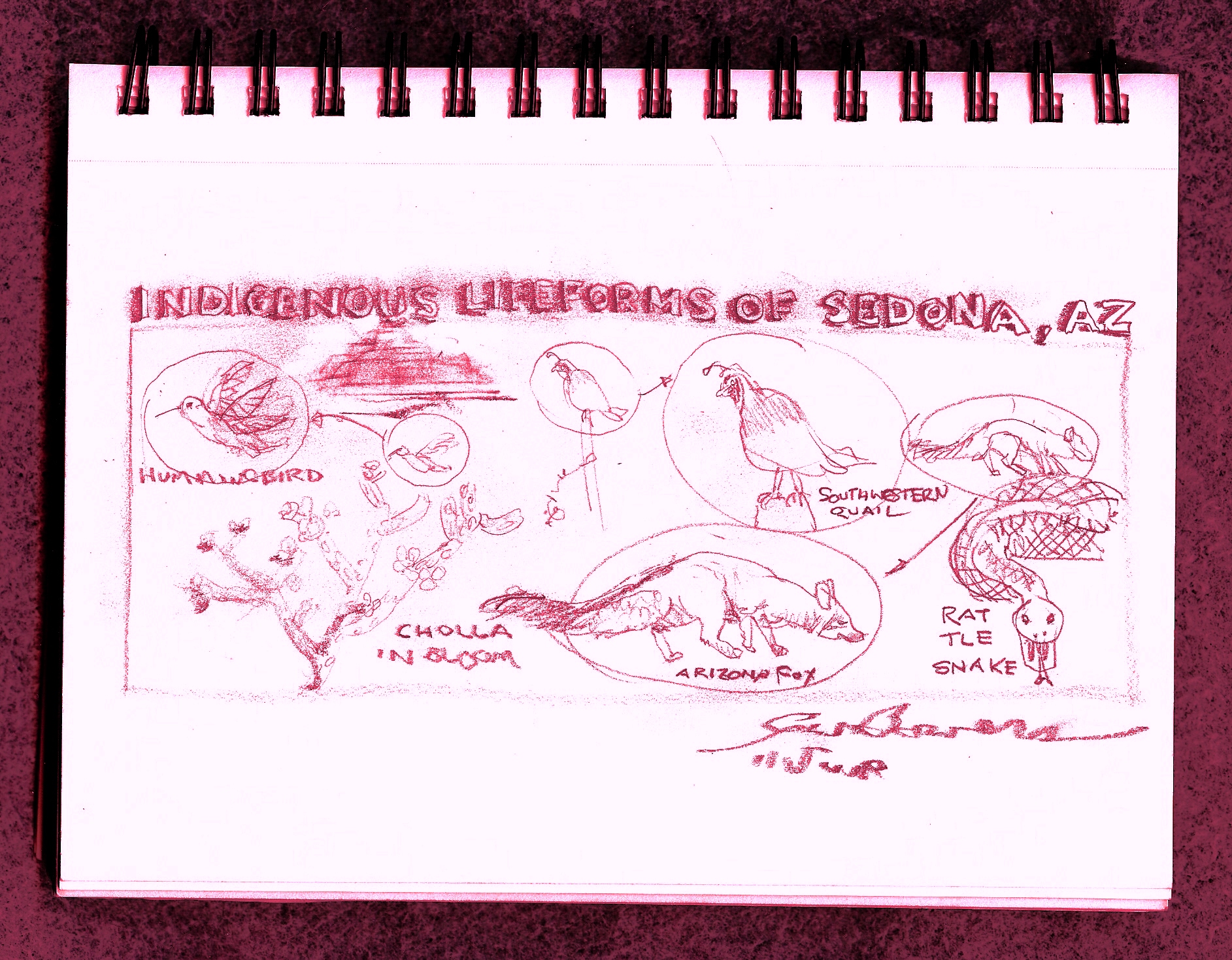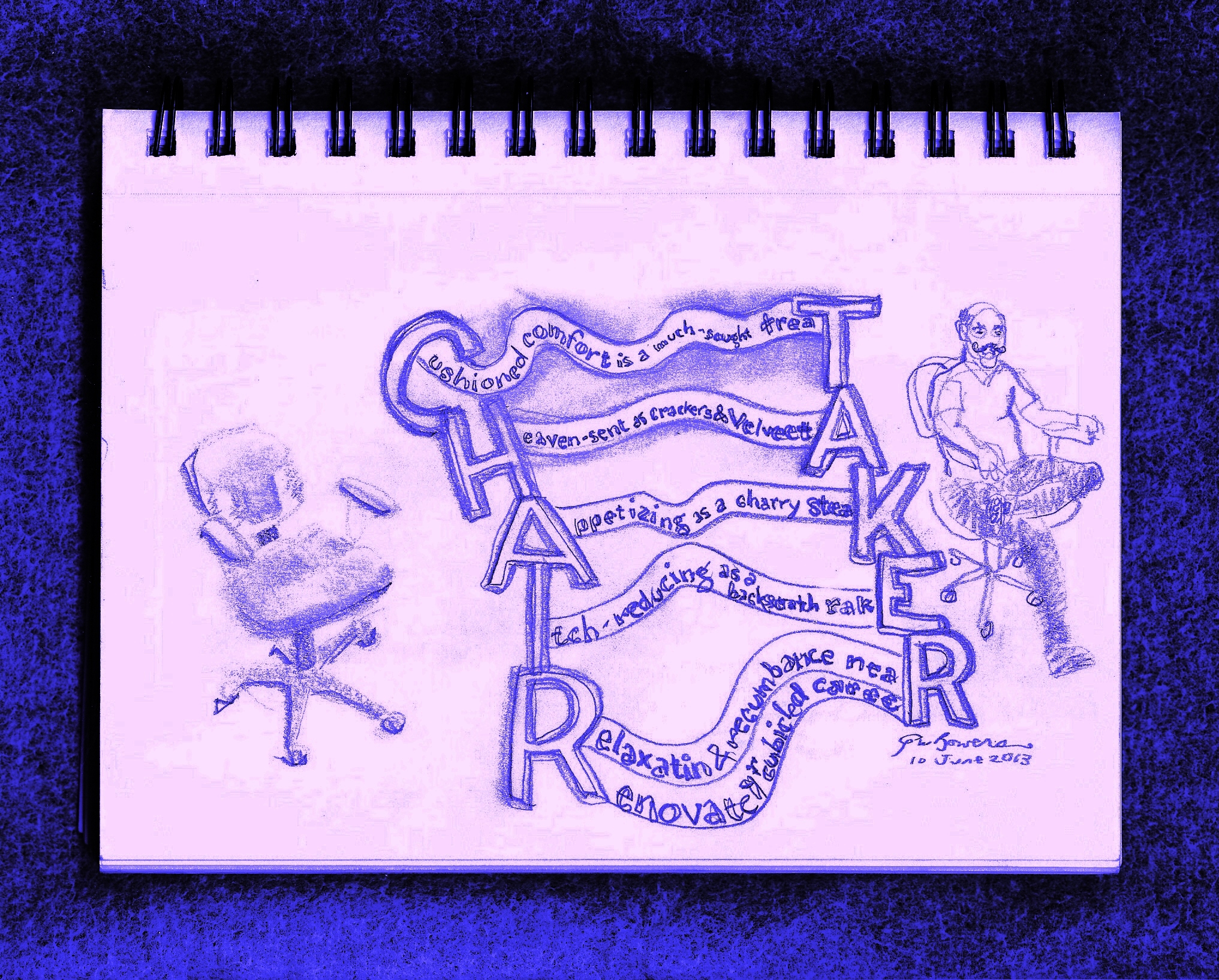 What does disaffectedness have to do with these three pages? It’s subtle. Chairs can be tyrannical, yet if they’re “perfectly good” we balk at spending money for a new one. The sketch of indigenous lifeforms came to be when my supervisor at work suggested I design a mural for the dining room, based on the local flora and fauna; I’m flexing compositional wings to produce good reporting of such while at the same time using inset spots and some text to make it not just any mural, but mine. As for the t.e.n.m.i.n.u.t.e.p.ag.e, I’m rebelling against my own compulsivity–I wanted to get the page done quickly and get on with my life. (It took more than twenty minutes to do the ten minute page, though. Irony writeoff, anyone?)