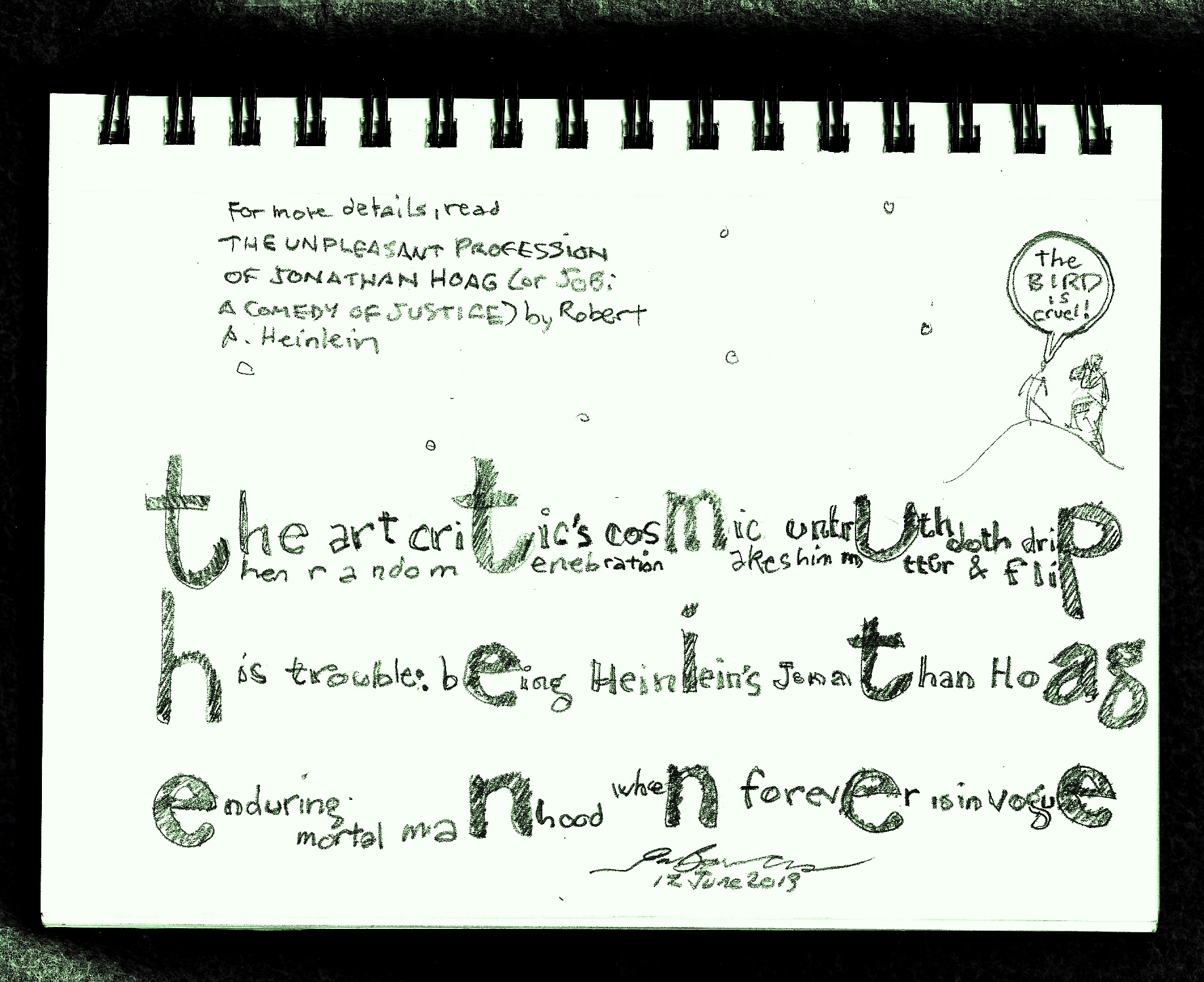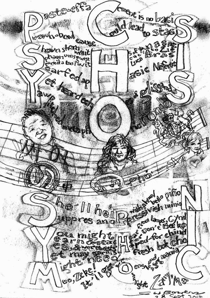 Early on in this image I’d intended to ask a musically-gifted friend to compose the three ending bars of the Psychosis Symphony–but the crazy-minded flavor of my acrostics made the route I took here suit the subject more fittingly. There is just enough musical notation to frame the elements, and that is another happy accident.