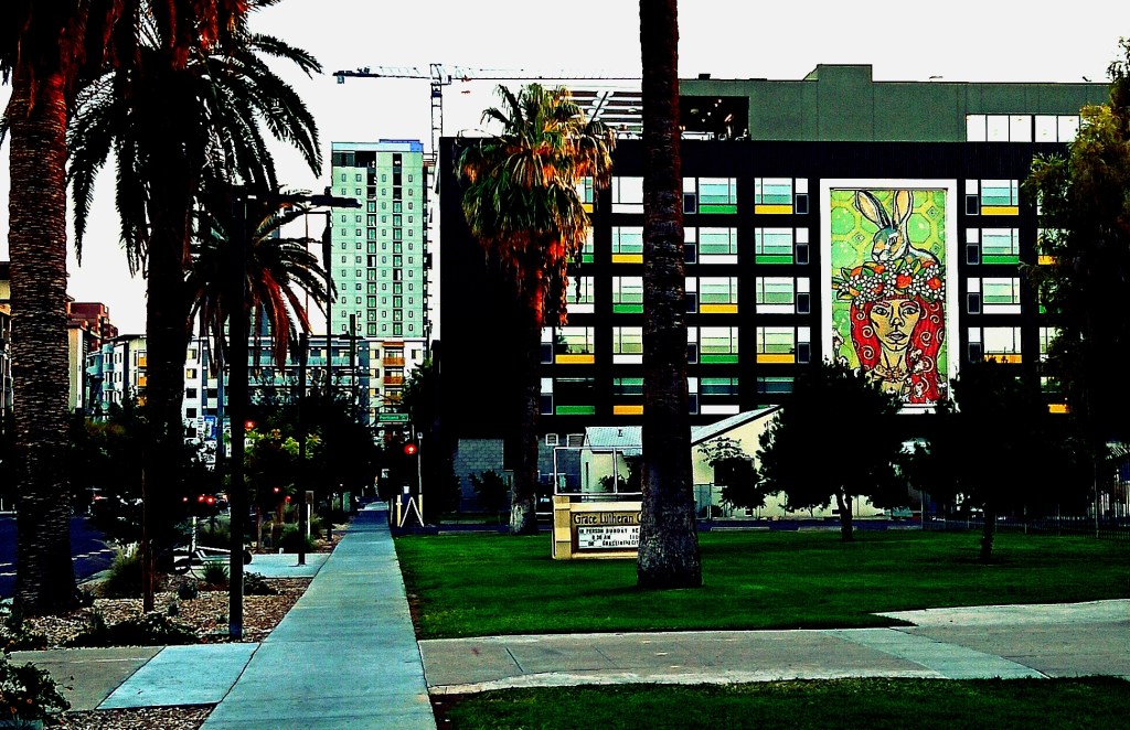 I was walking on a sidewalk in the heart of Phoenix, southbound on the west side of Third Street, South of McDowell but north of Portland, when I looked up and saw that both a work of art and a construction crane were in the field of view. And off to the right was Grace Lutheran Church, whose marquee invited virtual visitation via www dot graceinthecity dot com — an admirable choice of domain name.