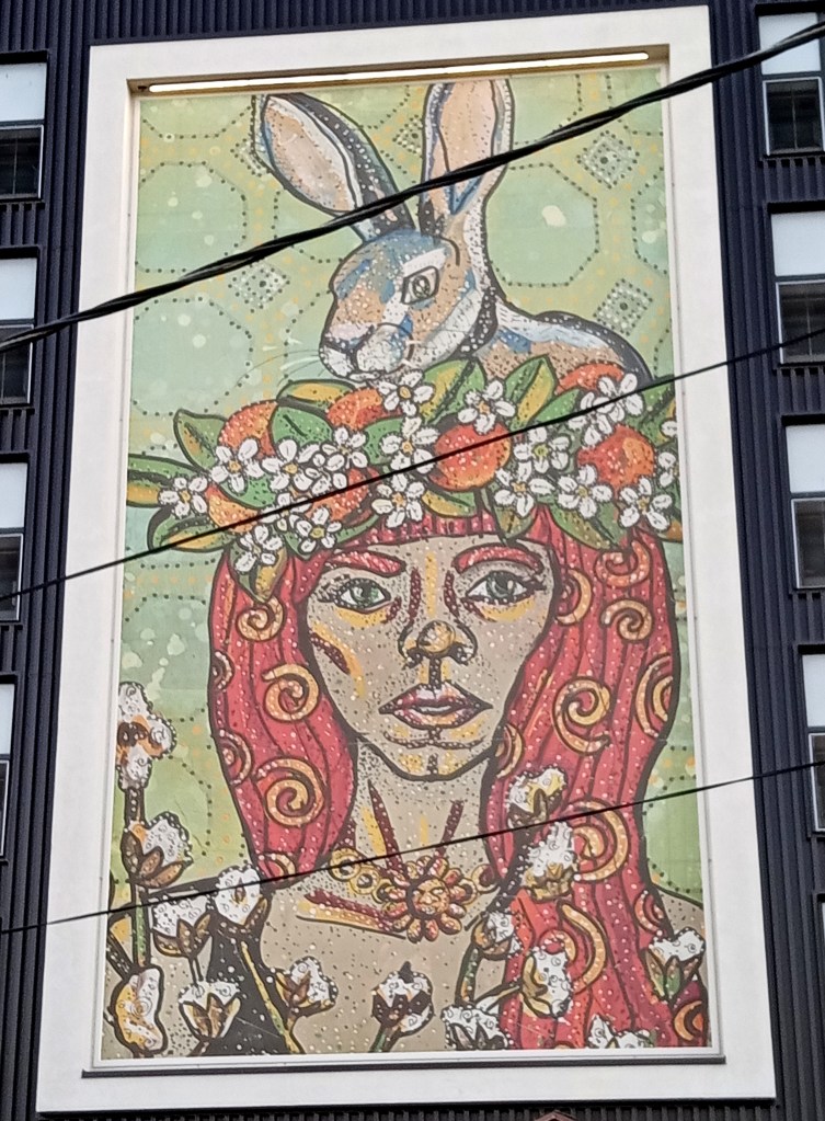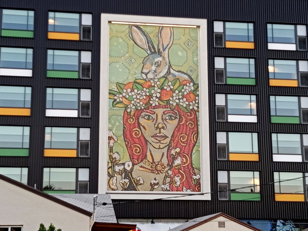 It was not possible to get much closer due to the area being fenced off. But even a few footsteps change the perceived reality to include power lines over the image, and though they do not interfere much with the artwork, they enhance in an urban/infrastructure sort of way.