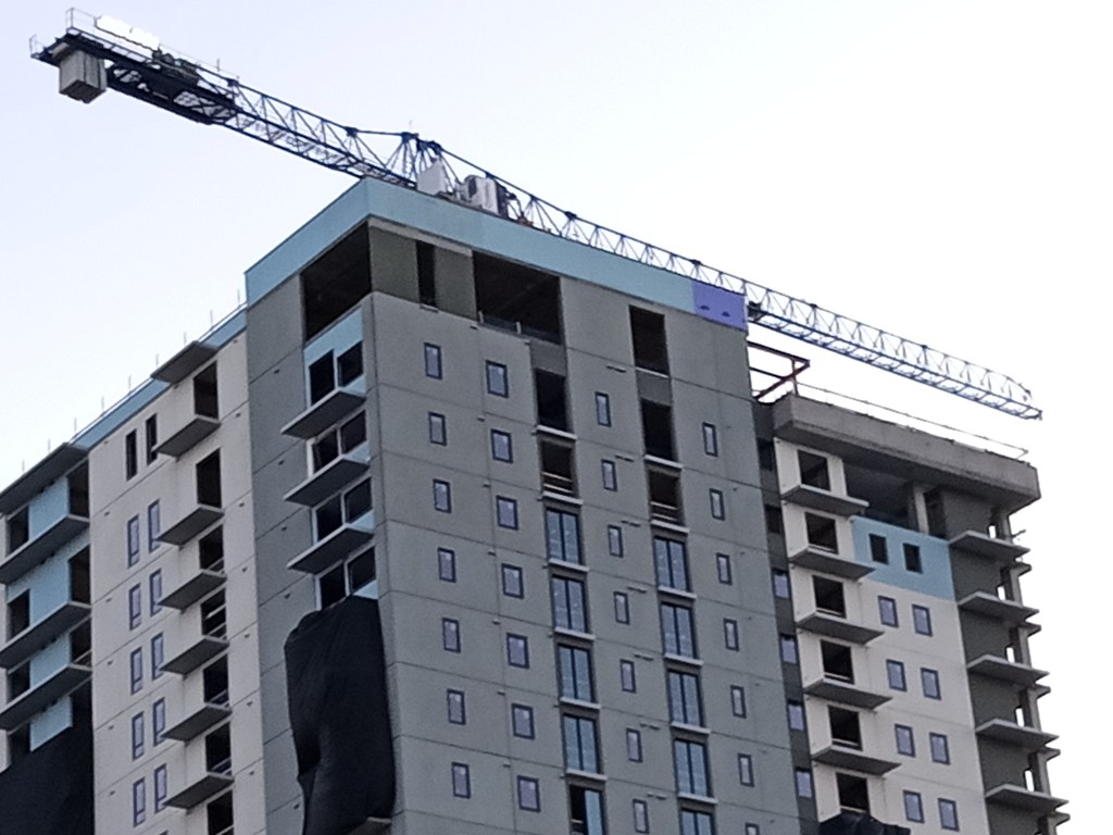 Continuing southbound brought the distant crane closer and closer. This necessitated more and more neck-tilting, which definitely alters the perceived reality of an arthritic 68-year-old man not currently taking pain medication.