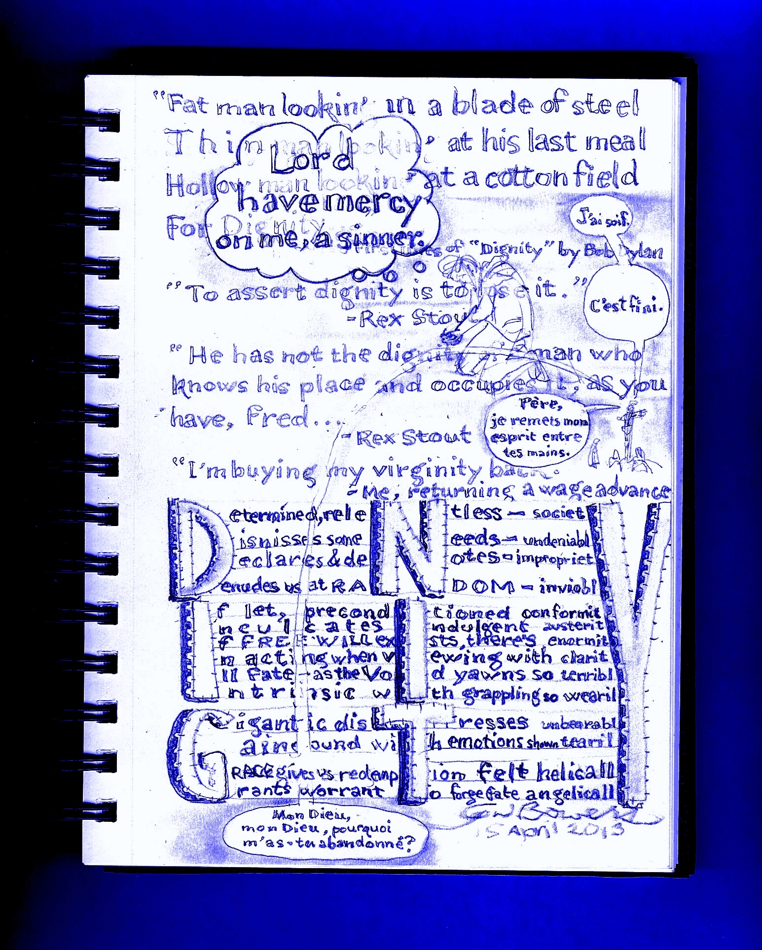 Before I tackled the acrostic, I talked to Denise about dignity, and asked her if Jesus on the cross saying “My God, my God, why have you forsaken me?” was an example of dignity. She made a good case for a Yes answer, since it was a question and not a cursing of God.