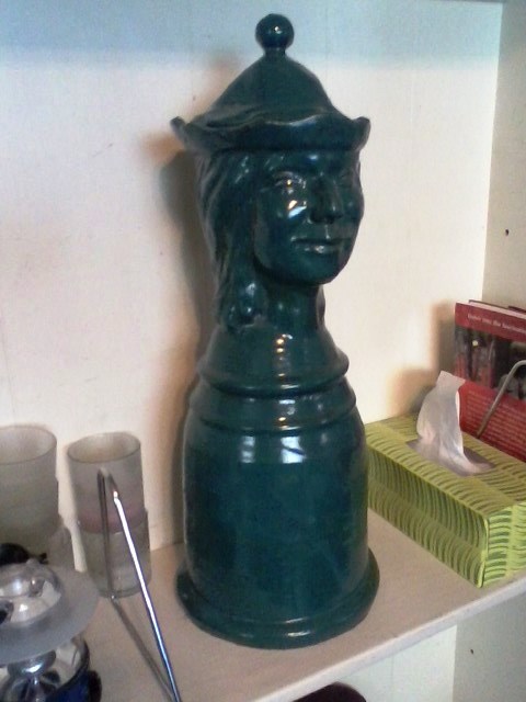 In my Phoenix visit yesterday (about which in a future post) I was happy to see my daughter had given my Green Queen, made, if memory serves, about ten years ago, and given to her thereafter, shelf space. She will preside over this true story: