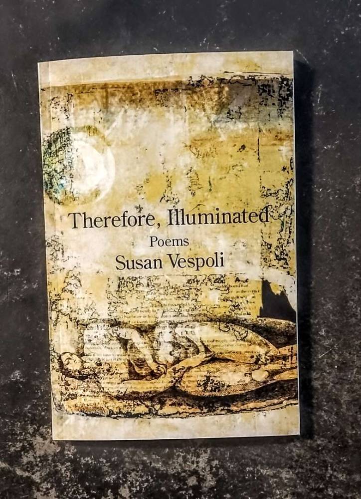 Afterword: My superbly talented poet friend Susan Vespoli sent me a copy of her new book Therefore, Illuminated. It is a continuation of One of Them was Mine, which told in voltaic verse of her unhoused, struggling son’s last few hours of life, and his death by handgun by a (now former) police officer who was later judged to be acting “out of policy.” We learn of the trial and grueling machinations that follow Vespoli’s wrongful death suit; of her daughter in the grip of drugs and depression, who paradoxically views being unhoused and drugged-up as “freedom” and has Vespoli walk a tightrope of helping without enabling; of a search through eHarmony for connection, and finding such with a tall, thin man who gives her, and her journey, much-needed relief and joy; and finally the coinciding of the delivery of the wrongful-death settlement check with a solar eclipse, as if the Universe was writing a poem of its own with a punchline of stunning metaphor.