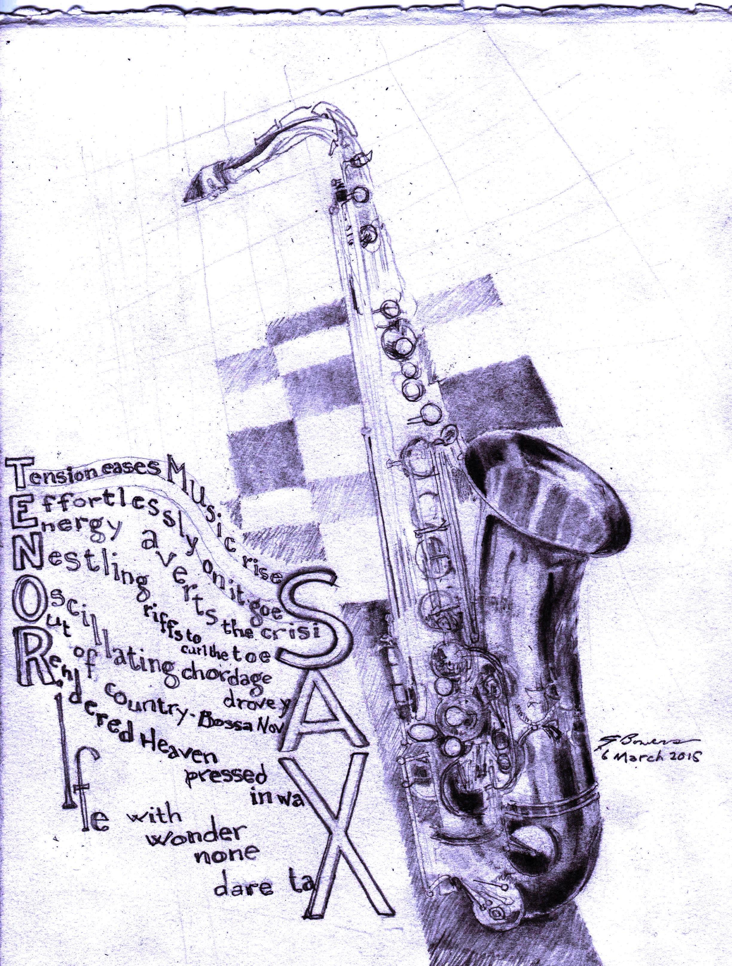 If March goes well, it will be chock-full of drawings of saxophones and jazz combos and portraits of major jazz musicians. In that spirit I kicked off March with a drawing of a saxophone of a friend of mine. No poetry, no “value added” distracting ancillary material–just a saxophone, a hint of the stand it rode in on, and some counterbalancing background.
