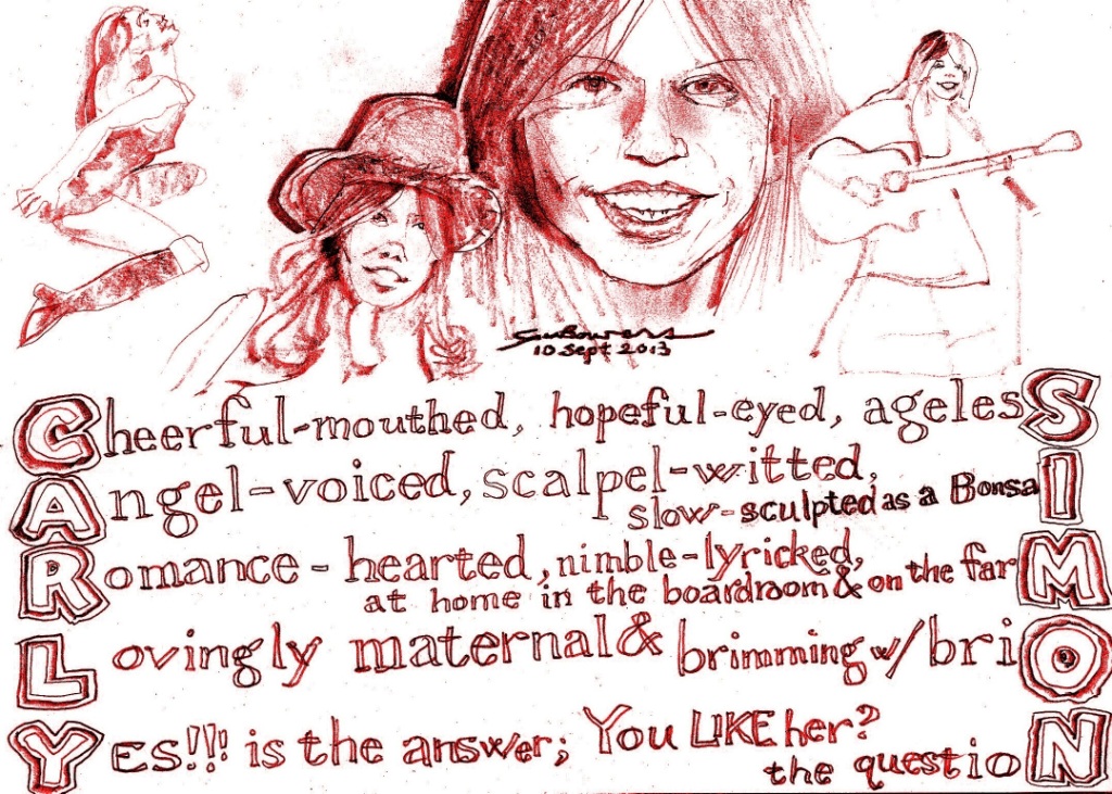 Three posts ago I quoted Carly Simon. I then realized that her name might make a doable double acrostic, and that I’d been smitten by her since the mid-70s, and that her spirit is ageless and enduring. Then I struggled for days. I could well struggle more, but I will never do her justice, so I rely on the adage “A work of art is never finished; it is only abandoned” and abandon ship.