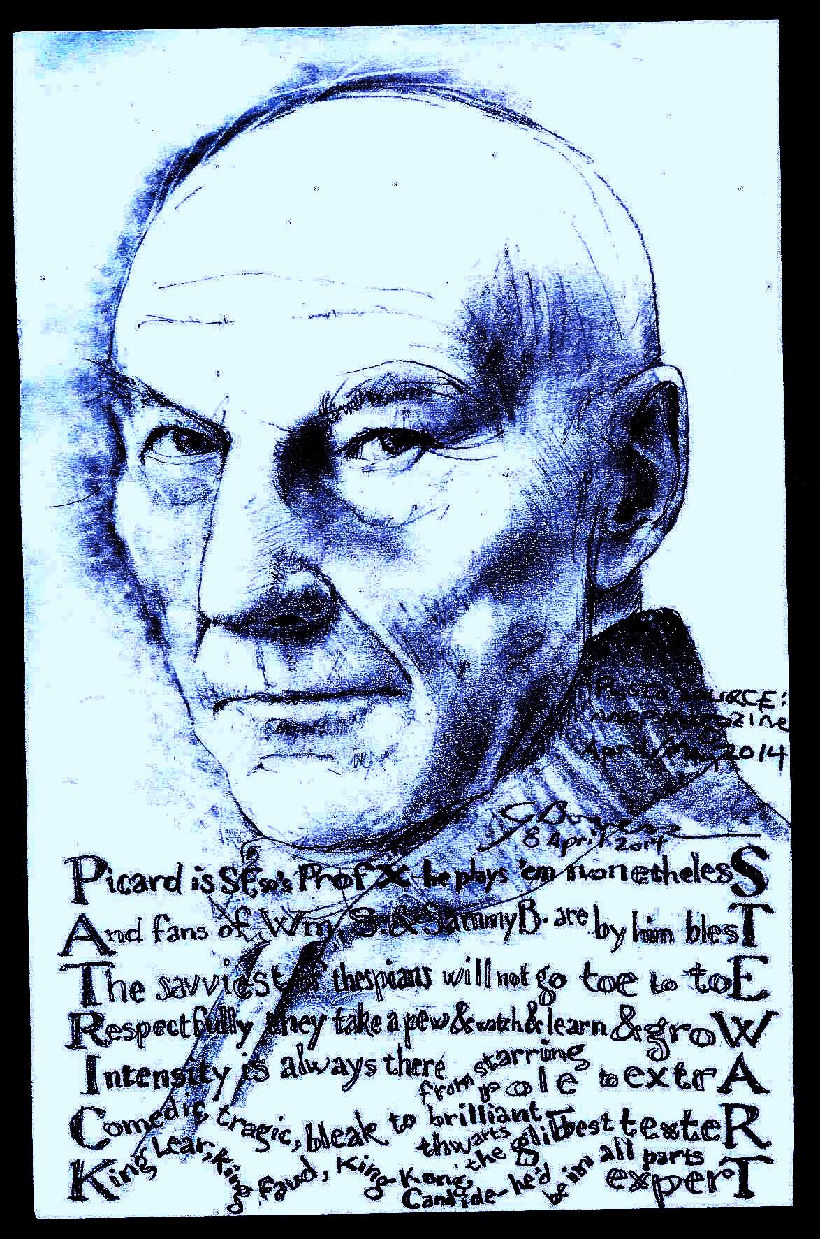 Here is the “finished” portrait and eponymous acrostic of Patrick Stewart. Something was lost in the finishing: freshness/likeness. Something was gained: the words that solved the poeticization.