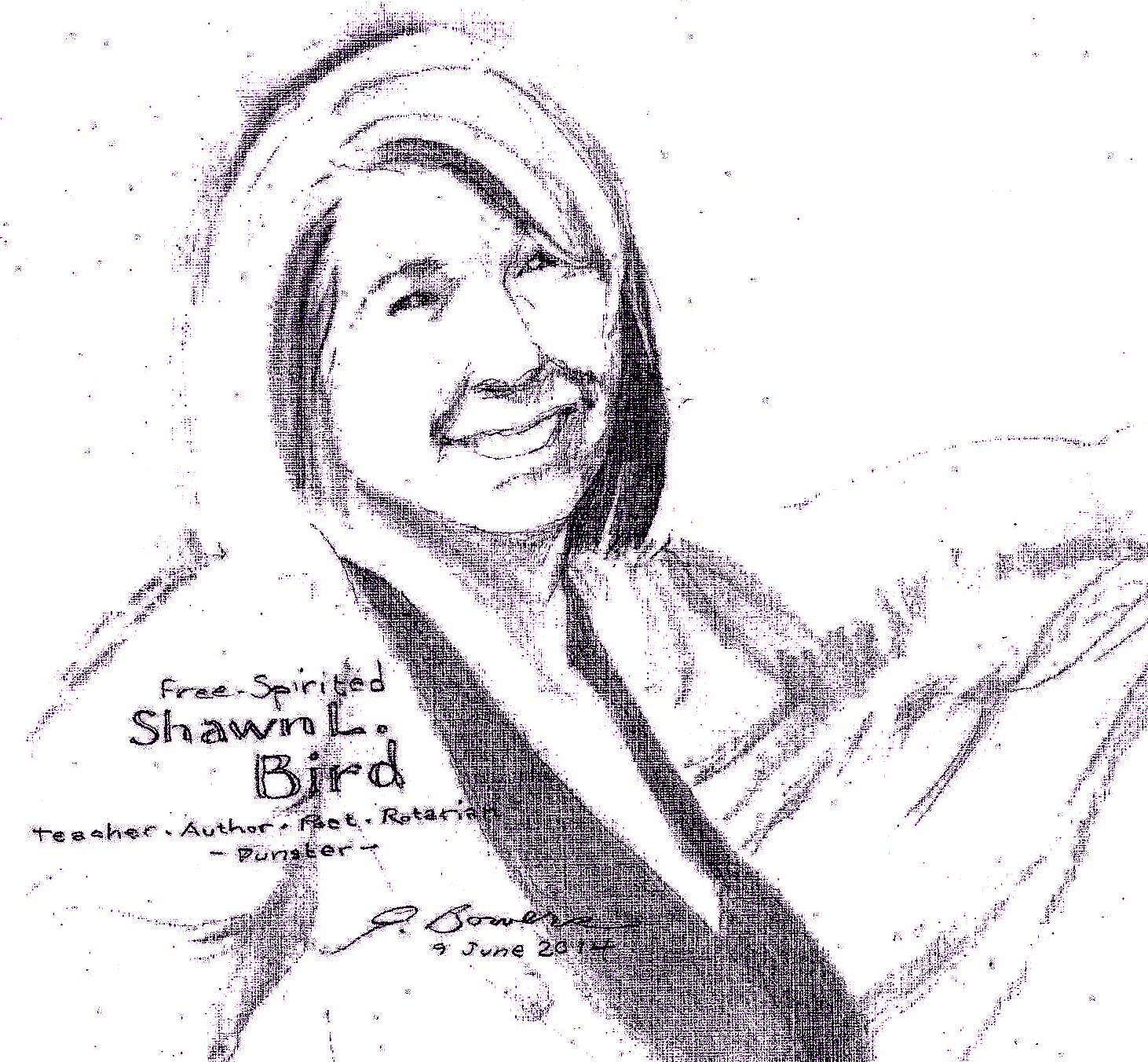 Shawn L. Bird is a poet, a novelist, and an educator. Here is my artist’s conception of her, but I do not do her justice, and I hope you visit her site to find that that is true.